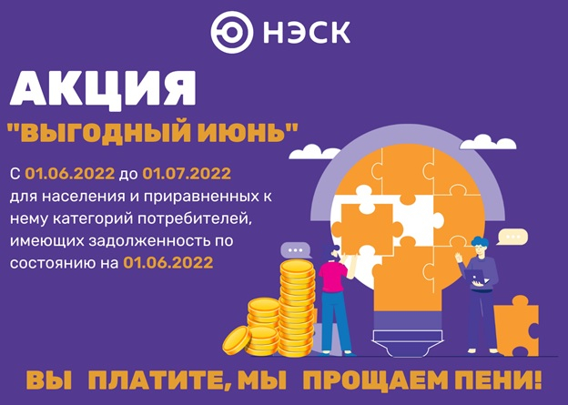 АО «НЭСК» предлагает населению и приравненным к нему категориям потребителей расплатиться с долгами за электроэнергию без учёта штрафных санкций в виде начисленных пеней и объявляет с 01 июня 2022 года о проведении акции «Выгодный июнь».